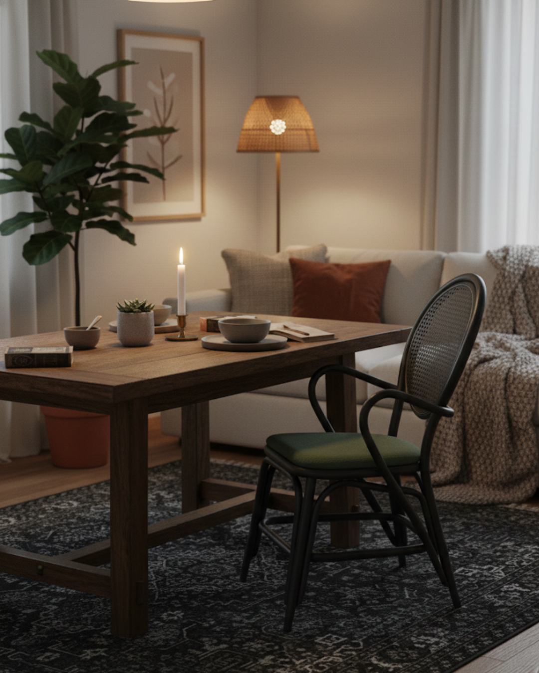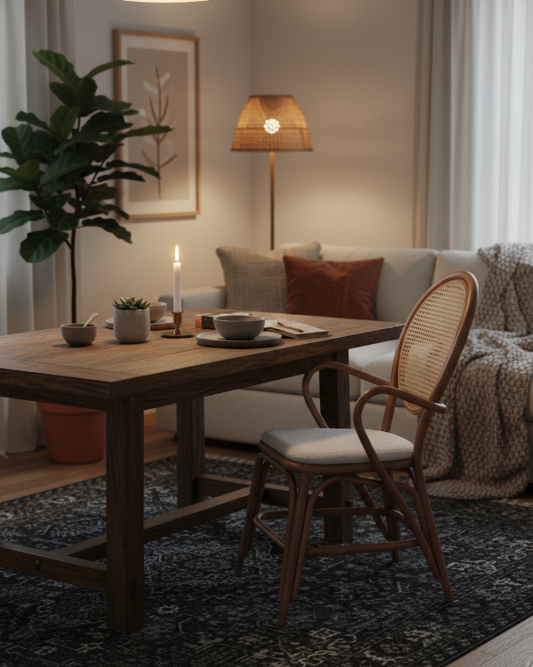 The Jove Dining Chair is crafted from woven rattan with a distinct silhouette that gives it a signature presence. Its curved back and handwoven texture highlight the natural material and craftsmanship. Lightweight but sturdy, Jove adds warmth and character to dining settings or relaxed communal areas.